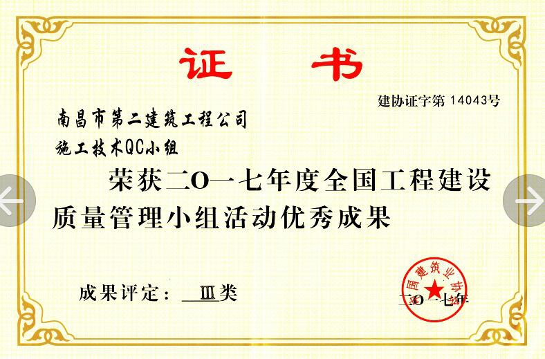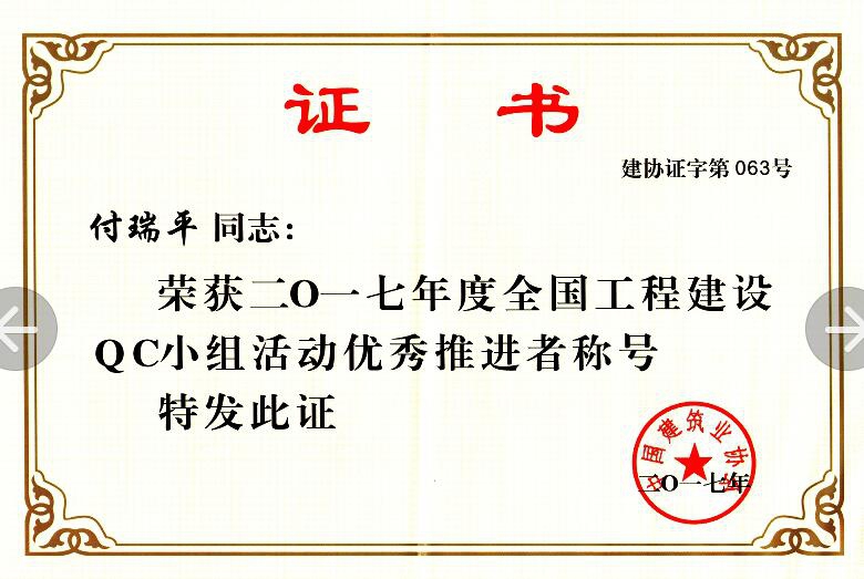 在中國建筑業(yè)協(xié)會組織的2017年度QC成果發(fā)布會上,公司QC小組的《提高GC發(fā)泡水泥保溫板外墻外保溫施工質(zhì)量》成果榮獲2017年度全國工程建設(shè)質(zhì)量管理小組活動優(yōu)秀成果獎;付瑞平同志榮獲2017年度全國工程建設(shè)QC小組活動優(yōu)秀推進(jìn)者稱號。